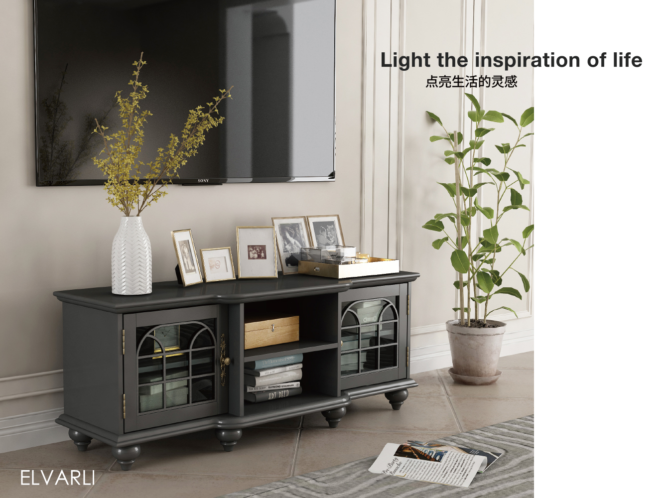 所有的面板边缘精致打磨圆润,优雅细致的圆角,防止尖利磕碰。 桌角和底部的转折曲线形成考究的曲线柱, 玻璃柜门用铁艺勾勒出简易的巴洛克风格的拱门门棱, 泛着微微黄铜光泽,把手上精致的雕花如同建筑上的精致雕饰, 三门储物柜的中间部分特意向外稍稍延伸,错落有致如同建筑的大门。 让人恍若置身罗马这座古老的城市, 时光宁静, 优雅生香。